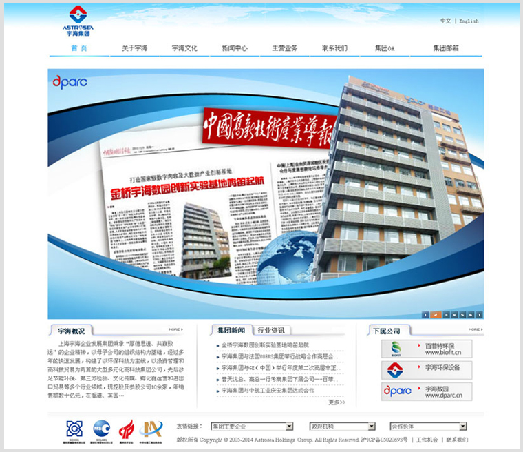 上海宇海企業(yè)發(fā)展集團(tuán)秉承“厚德思進(jìn)、共贏致遠(yuǎn)”的企業(yè)精神,以母子公司的組織結(jié)構(gòu)為基礎(chǔ),經(jīng)過多年的快速發(fā)展,構(gòu)建了以環(huán)?萍紴橹骶,以投資管理和高科技貿(mào)易為兩翼的大型多元化高科技集團(tuán)公司,先后涉足節(jié)能環(huán)保、第三方檢測、文化傳媒、孵化器運營和進(jìn)出口貿(mào)易等多個行業(yè)領(lǐng)域,現(xiàn)控股及參股公司10余家,年銷售額數(shù)十億元。